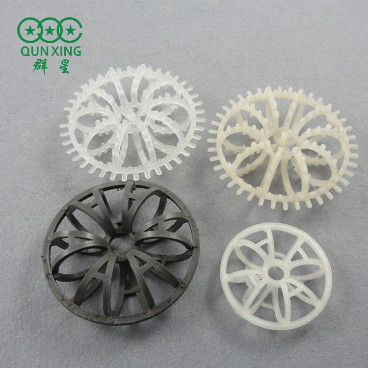 塑料花環(huán)填料主要利用其獨D特結(jié)構(gòu)形狀多分布點與接觸表面積,與廢氣或廢液呈點接觸,以去Q除氣體和液體中的微粒,吸收有害的腐蝕性氣體。使用時將液體或氣體反方向道入填料填充床內(nèi),氣體經(jīng)過分配板,將氣體平均分布于球狀填料中,每只呈點接觸,利用接觸的表面積,除氣體和液體中的微粒吸收有害的氣體。這種填料是由許多圓環(huán)結(jié)繞而成,由于填料的空隙處能有較高的持液量,可使塔內(nèi)液體的停留時間較長,從而增加了氣液兩相的接觸時間,提高了填料的傳質(zhì)效率。