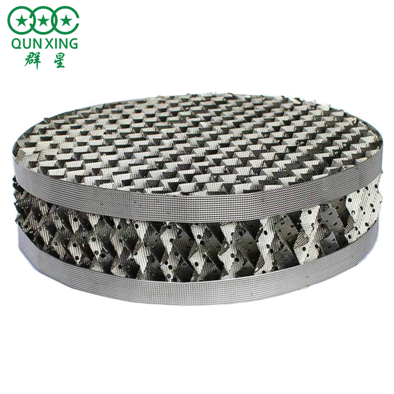金屬填料適用于真空精餾塔,處理G敏性、易分解、易緊合、易結(jié)碳的物料,金屬填料廣泛用于石化、化肥、化工、H保等行業(yè)的填料塔中。金屬填料分為金屬散堆填料(鮑爾環(huán)、矩鞍環(huán)、階梯環(huán)、共軛環(huán)、八四內(nèi)弧環(huán)、扁環(huán)等)和金屬規(guī)整填料(金屬絲網(wǎng)波紋填料、金屬孔板波紋填料、壓延刺孔板波紋填料、金屬網(wǎng)板波紋填料、HT 半管式規(guī)整填料)。金屬填料的優(yōu)缺點都非常明顯,其優(yōu)點在于其可以加工成各種幾何形狀結(jié)構(gòu)的填料、良好的潤濕性、耐高溫性、壓降小、金屬填料裝塔時不會破碎、便于裝卸和清理;由于其強度高,彈性模量大,因而可以使填料的壁厚加工的很薄:若制備成波紋填料,其板的厚度一般在01~15mm;而若制備成絲網(wǎng)波紋填料,國外不銹鋼絲直徑一般為016mm左右,國內(nèi)絲網(wǎng)規(guī)格不一,通常在01到025mm之間。但是金屬填料缺點是制造價格貴、加工成本高,雖說一次性投資稍大,但卻能發(fā)揮塔設(shè)備的潛在力;此外金屬填料成型工藝復(fù)雜、耐各類酸堿溶液的腐蝕性較差、使用壽命較短,一般在兩年左右。金屬填料可用多種不同的金屬材質(zhì)加工制備,一般而言,金屬填料可根據(jù)實際應(yīng)用的需要可選用不銹鋼、碳鋼、C4鎳基合金、蒙乃爾合金、鋁、青銅、鎳、鈦等金屬作為基質(zhì)制備加工填料。對不同材質(zhì)選擇時主要考慮其耐腐蝕性的問題,碳鋼材質(zhì)填料造價低,且具有良好的表面潤濕性能,對于無腐蝕或腐蝕性比較低的物系,一般給與優(yōu)先考慮使用;不銹鋼填料耐腐蝕性較強,一般能夠耐除C1以外常見物系的腐蝕,但其造價成本較高,并且表面潤濕性能相對較差,除了在某些特殊的應(yīng)用場合(如極低噴淋密度下的減壓精餾過程)才考慮使用,使用前通常需要對其表面進(jìn)行處理,以提高其表面的潤濕性,這樣不銹鋼填料才能取得良好的使用效果;對于鈦材、特種合金鋼等材質(zhì)制成的填料由于造價很高,一般在某些腐蝕性極強的物系下使用,使用范圍很有限。圖12為金屬散堆填料和金屬規(guī)整填料實物圖。